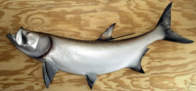 FREE SHIPPING. The Silver King. This is a half mount taxidermy fiberglass replica of a big Tarpon about 100 pounds or so. The majesty of a leaping, twisting, splashing and reel screaming tarpon can be brought into your home, office or place of business. This immaculate replica measures 74 inches from tip to tail. This is truly magnificent trophy. This mount is over sized. Estimated shipping time is about 2-3 weeks.